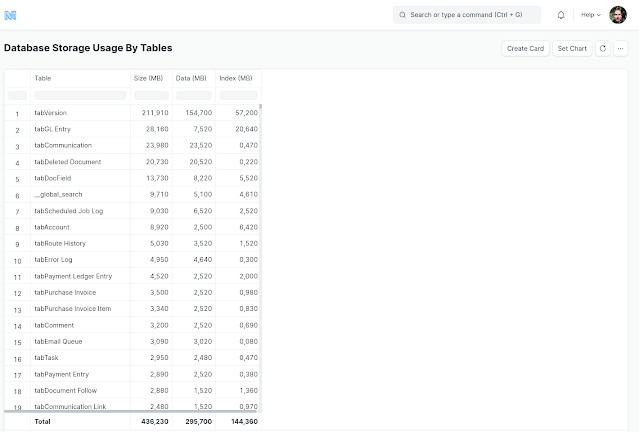Az ERPNext nem csak a FrappeCloud platformját alakította ki transzparensen, ahol látható, hogy mekkora erőforrást is használ az ERPNext szoftver, hanem magát az ERPNextet is felvértezte egy riport funkcióval, hogy megnézhessük valójában mi mennyit foglal az adatbázisban.